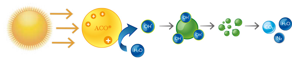 强烈的太阳光会催化ACO®将水分子分解为羟基自由基,羟基自由基氧化有机物和有毒污染物,形成无害水和二氧化碳。
