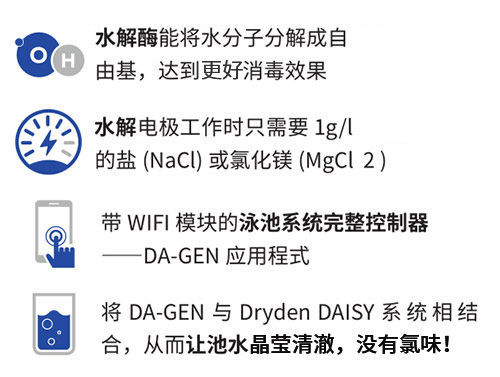 DA-GEN是一种为您泳池服务的,创新的泳池消毒解决方案。它利用氧化技术产生自由基(OH·和O·),自由基是高性能氧化剂,其优点是不会产生任何有害的消毒副产物。与我们的DrydenDAISY®系统配套使用,让池水晶莹清澈,没有氯味!